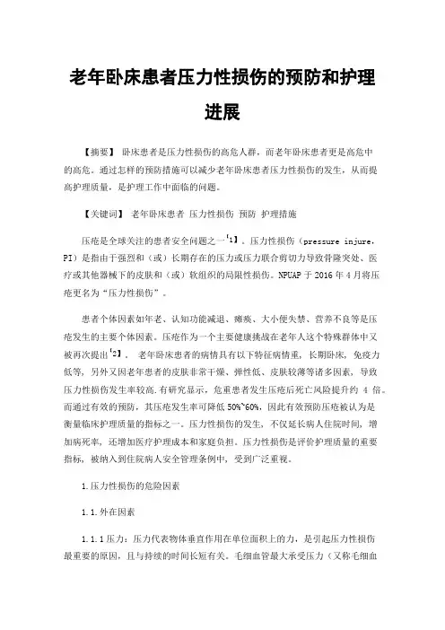 老年卧床患者压力性损伤的预防和护理进展【摘要】卧床患者是压力性损伤的高危人群,而老年卧床患者更是高危中的高危。