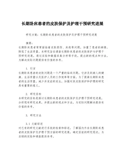 长期卧床患者的皮肤保护及护理干预研究进展研究方案:长期卧床患者的皮肤保护及护理干预研究进展摘要:长期卧床患者常常面临着皮肤损伤、床疮等问题,加重了患者的病情,降低了生活质量。
