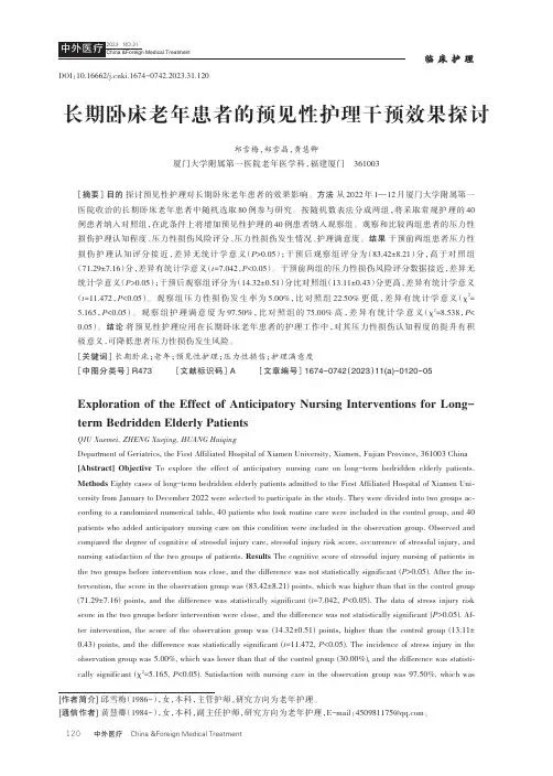 DOI:10.16662/ki.1674-0742.2023.31.120长期卧床老年患者的预见性护理干预效果探讨邱雪梅,郑雪晶,黄慧卿厦门大学附属第一医院老年医学科,福建厦门361003[摘要]目的探讨预见性护理对长期卧床老年患者的效果影响。