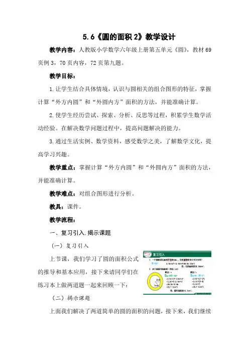 5.6《圆的面积2》教学设计教学内容:人教版小学数学六年级上册第五单元《圆》,教材69页例3,70页内容,72页第九题。