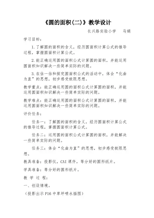 1.7圆的面积(二)教学设计一、教学目标1.学习目标描述:能正确运用圆的面积公式计算圆的面积,并能解决一些简单的实际问题;在多个探究圆面积公式的活动中,体会圆的半径、周长、面积之间的关系。