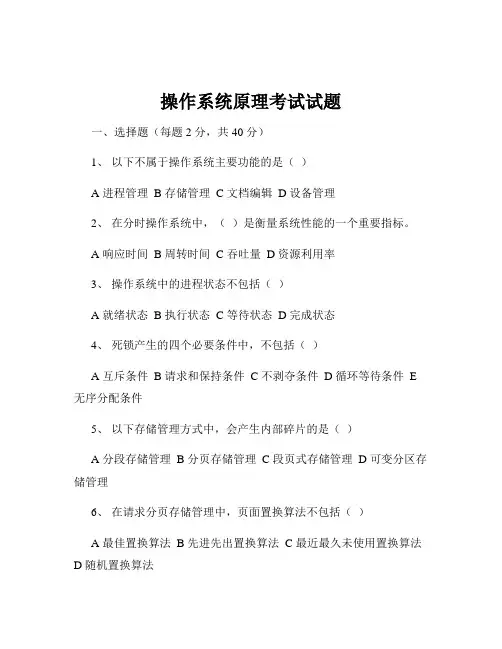 操作系统原理考试试题一、选择题(每题 2 分,共 40 分)1、以下不属于操作系统主要功能的是()A 进程管理B 存储管理C 文档编辑D 设备管理2、在分时操作系统中,()是衡量系统性能的一个重要指标。