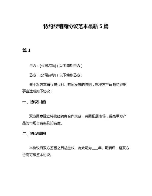 特约经销商协议书范本5篇篇1甲方:[公司名称](以下简称甲方)乙方:[特约经销商名称](以下简称乙方)甲、乙双方本着平等互利、共同发展的原则,经友好协商,就乙方作为甲方产品的特约经销商事宜,达成以下协议。