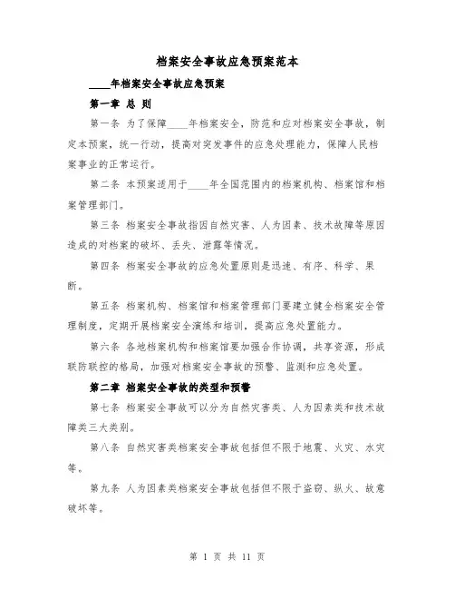档案安全事故应急预案范本____年档案安全事故应急预案第一章总则第一条为了保障____年档案安全,防范和应对档案安全事故,制定本预案,统一行动,提高对突发事件的应急处理能力,保障人民档案事业的正常运行。