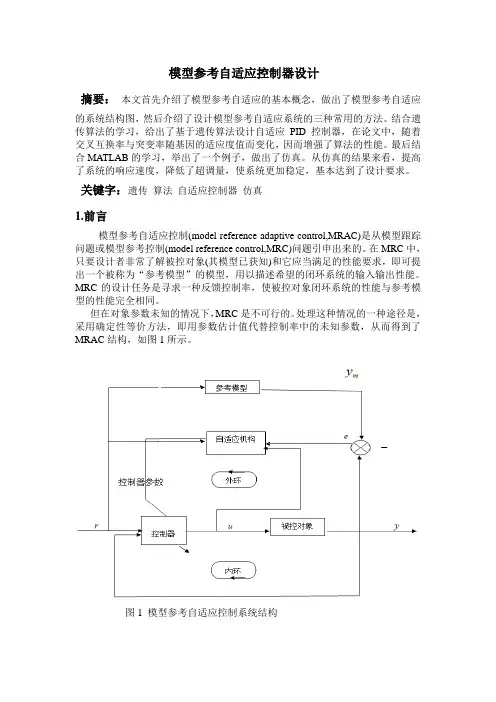 关键字:遗传算法自适应控制器仿真1.前言模型参考自适应控制(model reference adaptive control,MRAC)是从模型跟踪问题或模型参考控制(model reference control,MRC)问题引申出来的。