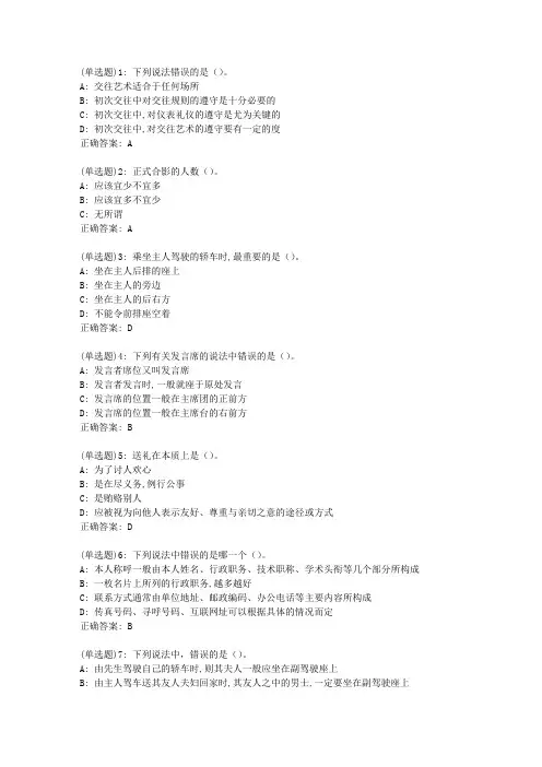 A、接受他人的名片时,应该不管多忙都要起身接名片B、在接受名片的时候应该用右手,但是也可以只用左手C、收到他人的名片后,切勿对其随意把玩,或者将其乱丢乱放D、接受他人名片之后,一般均应当即回上对方一枚自己的名片正确答案:B第3题,在交往艺术中,能使我们在交往中尽量避免犯错误和因交往失误而带来的过失,这种功能叫()A、减灾效应B、晕轮效应C、首轮效应D、内强素质正确答案:A第4题,指人们或其使用之物在人际交往中,彼此之间各自所处的具体位置的尊卑顺序,这叫()。