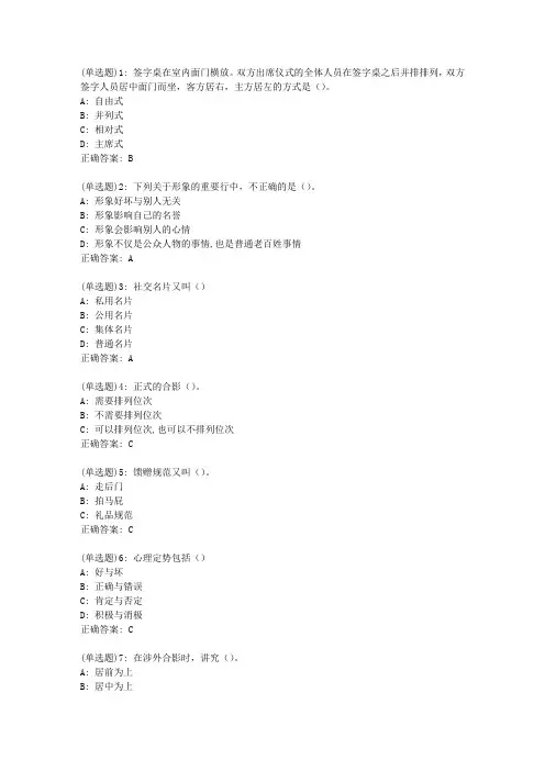 A、位置B、次序C、位次D、地位正确答案:C第5题,由主人面对正门而坐,其他各方来宾则应在其对面背门而坐,这种方式叫()。