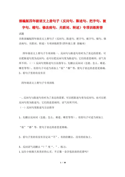 部编版四年级语文上册句子(反问句、陈述句、把字句、被字句、缩句、修改病句、关联词、转述)专项训练附答试题名称部编版四年级语文上册句子(反问句、陈述句、把字句、被字句、缩句、修改病句、关联词、转述)专项训练附答(四年级上册部编本)四年级语文上册句子专项训练一、反问句与陈述句有时为了表达的需要,可以把陈述句变为反问句,也可以把反问句变为陈述句,它们的意思相同,语气有所不同。