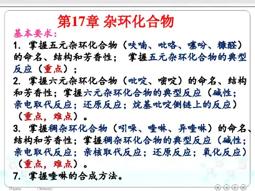 第十七章杂环化合物(heterocyclic compounds)在环状化合物的环中含有碳以外的杂原子,这类化合物统称为杂环化合物。