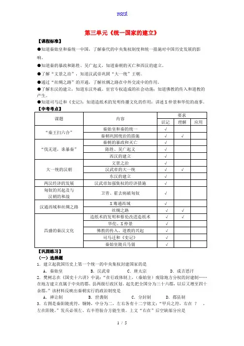 第三单元统一国家的建立[课标链接](本单元的内容标准)1、了解秦兼并六国和秦始皇加强中央集权的史实,探讨统一国家建立的意义。