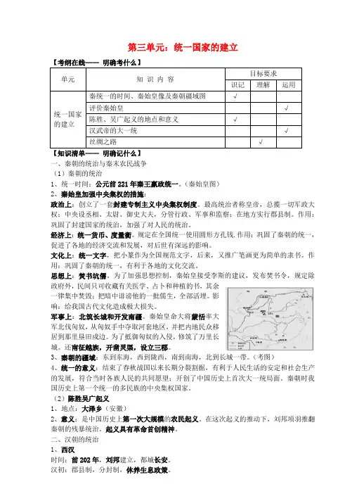 )统秦的统一及意义一秦朝加强中央集权的措施国陈胜、吴广起义秦家汉的文景之治汉武帝大一统文建汉朝匈奴与汉朝的关系化立民族关系户张骞通西域汉朝与西域的关系丝绸之路[重难点拨](对本单元重点难点简要解析、点拨、指导)1、秦的统一,应掌握秦统一六国的时间,秦朝的都城。