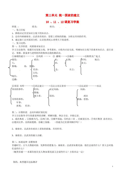 第三单元统一国家的建立10 、11 、12课复习学案班级:_________ 组名:_________ 姓名:_________一、复习目标1、熟练识记历史知识主线下的知识点。