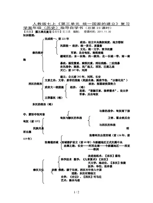二、构建系统1.秦的统一与灭亡:奠定统一基础(战役)→实现统一大业(公元前221年)→巩固统一措施(政治、经济、思想、文化、军事)→成为统一大国(疆域四至)→暴政统治而亡(前207年,关键战役是)2.汉匈关系:战(秦末汉初匈夺取河套地区)→和(汉高祖时国力衰弱,实行屈辱的“和亲”)→战(汉武帝时,国力强盛,大破匈奴)→和(汉元帝时,昭君出塞,友好相处)对民族关系的看法:古代民族关系有战有和,和为主流;各民族应该和平相处,共同发展,共同繁荣;中华文明是由各民族共同创造的。