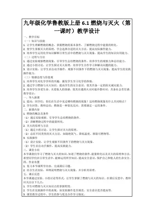 初三化学燃烧与灭火第一课时教案教学反思优秀教案一、教学目标1.了解燃烧的条件,理解燃烧的现象和本质。