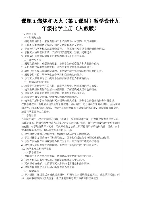 三、课时安排本课程共分为两课时:课时1 燃烧的条件及灭火的原理课时2 易燃、易爆物的安全知识课时1 燃烧的条件及灭火的原理一、教学目标1. 了解燃烧的概念,并通过实验探究,认识物质燃烧所需要的条件;2. 通过实例探究与分析,了解灭火的原理和方法;3. 学习安全消防常识,认识化学知识在生活实际中的应用。