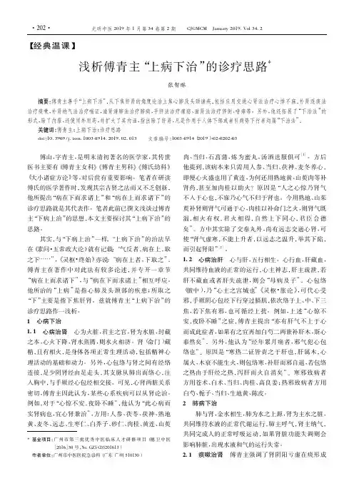 关键词:傅青主;上病下治;诊疗思路doi :10.3969/j.issn.1003-8914.2019.02.013文章编号:1003-8914(2019)-02-0202-03*基金项目:广州市第三批优秀中医临床人才研修项目(穗卫中医[2016]30号,No.GZYC03201613)作者单位:广州市中医医院急诊科(广东广州510130)傅山,字青主,是明末清初著名的医学家,其传世医书主要有《傅青主女科》《傅青主男科》《傅氏幼科》《大小诸症方论》等,对后世有重要影响。