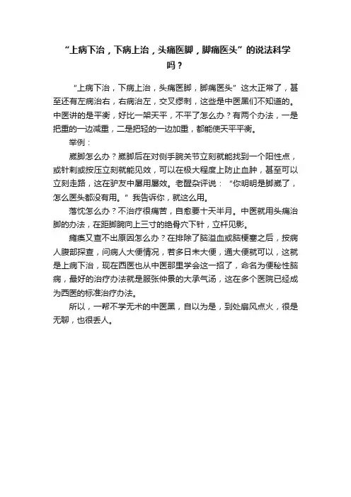其实,与“下病上治”一样,“上病下治”的治法早在《素问·五常政大论》就有记载:“气反者,病在上,取之下……”,《灵枢·终始》亦说:“病在上者,下取之”。