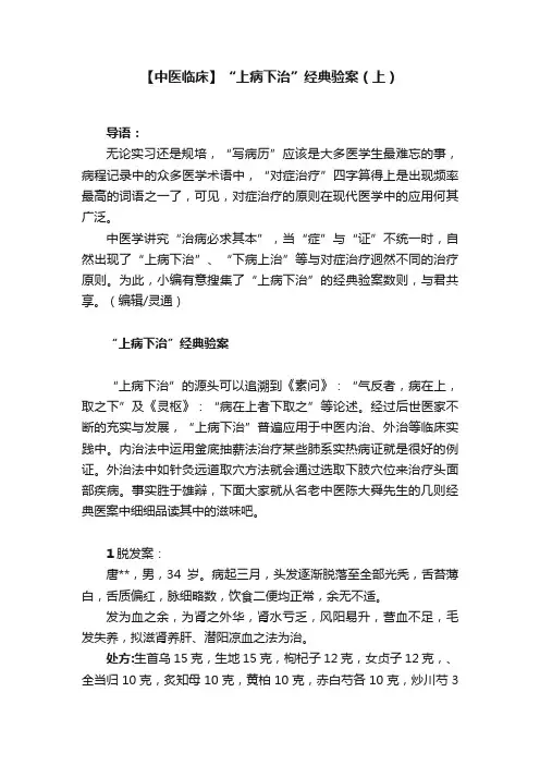 (编辑/灵通)“上病下治”经典验案“上病下治”的源头可以追溯到《素问》:“气反者,病在上,取之下”及《灵枢》:“病在上者下取之”等论述。