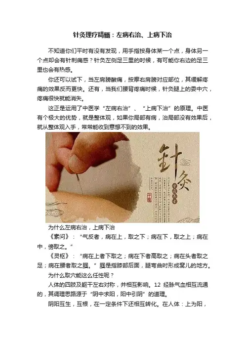 针灸理疗精髓:左病右治、上病下治不知道你们平时有没有发现,用手指按身体某一个点,身体另一个点却会有针刺痛感?针灸左侧足三里的时候,有可能你右边的足三里也会有热感。