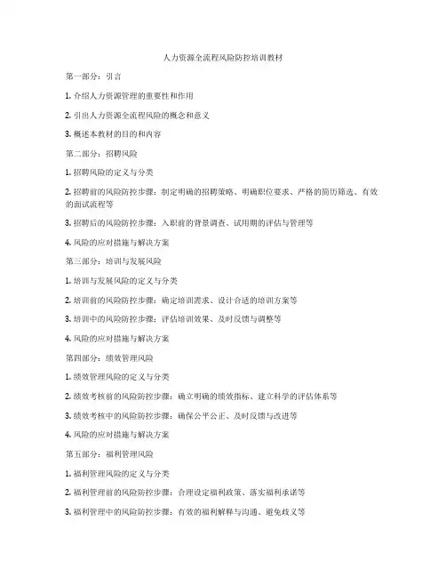 人力资源全流程风险防控培训教材第一部分:引言1. 介绍人力资源管理的重要性和作用2. 引出人力资源全流程风险的概念和意义3. 概述本教材的目的和内容第二部分:招聘风险1. 招聘风险的定义与分类2. 招聘前的风险防控步骤:制定明确的招聘策略、明确职位要求、严格的简历筛选、有效的面试流程等3. 招聘后的风险防控步骤:入职前的背景调查、试用期的评估与管理等4. 风险的应对措施与解决方案第三部分:培训与发展风险1. 培训与发展风险的定义与分类2. 培训前的风险防控步骤:确定培训需求、设计合适的培训方案等3. 培训中的风险防控步骤:评估培训效果、及时反馈与调整等4. 风险的应对措施与解决方案第四部分:绩效管理风险1. 绩效管理风险的定义与分类2. 绩效考核前的风险防控步骤:确立明确的绩效指标、建立科学的评估体系等3. 绩效考核中的风险防控步骤:确保公平公正、及时反馈与改进等4. 风险的应对措施与解决方案第五部分:福利管理风险1. 福利管理风险的定义与分类2. 福利管理前的风险防控步骤:合理设定福利政策、落实福利承诺等3. 福利管理中的风险防控步骤:有效的福利解释与沟通、避免歧义等4. 风险的应对措施与解决方案第六部分:员工离职风险1. 员工离职风险的定义与分类2. 离职前的风险防控步骤:正确认识员工离职的原因、进行妥善处理等3. 离职中的风险防控步骤:保障企业利益、维护员工合法权益等4. 风险的应对措施与解决方案第七部分:总结与答疑1. 对全流程风险的总结与回顾2. 解答学员对于人力资源全流程风险的提问3. 宣布培训考核方式与要求第八部分:自我评估与作业1. 提供相关案例,要求学员进行风险防控方案的制定2. 要求学员针对自身岗位的人力资源全流程进行风险评估并写出相应预防与解决措施第九部分:课程结束与总结1. 总结培训内容和收获2. 对学员进一步学习和实践的建议3. 表达对学员的祝福与期望注:以上内容仅为参考,具体教材编写需要根据实际情况和培训目的进行调整和完善。
