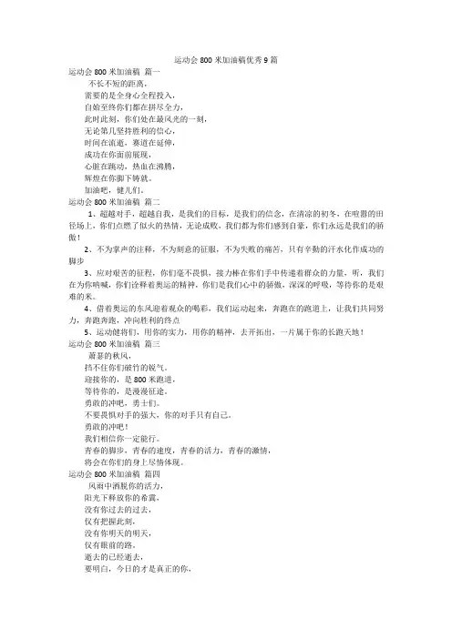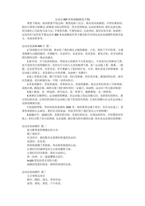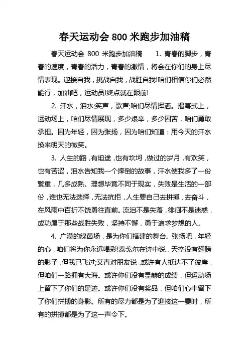 800米加油稿大全(16篇)800米加油稿大全(通用16篇)800米加油稿大全篇1运动健儿们!阵阵有力的步伐,声声有劲的呐喊,运动场上洒下我们青春的点点滴滴。