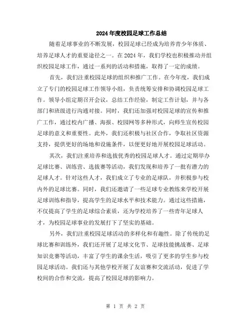 2024年度校园足球工作总结随着足球事业的不断发展,校园足球已经成为培养青少年体质、培养足球人才的重要途径之一。