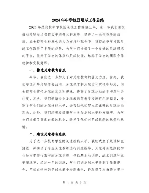 2024年中学校园足球工作总结2024年是我校中学校园足球工作的第三年,这一年我们积极推动足球运动在校园中的普及和发展,取得了一系列显著的成绩。