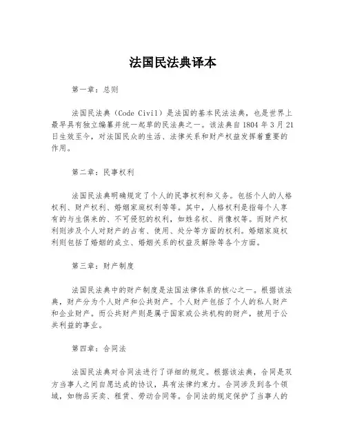 法国民法典译本第一章:总则法国民法典(Code Civil)是法国的基本民法法典,也是世界上最早具有独立编纂并统一起草的民法典之一。