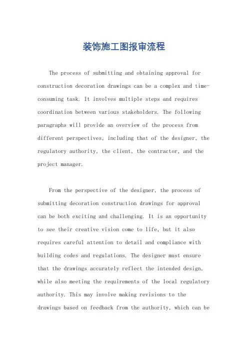 装饰施工图报审流程The process of submitting and obtaining approval for construction decoration drawings can be a complex and time-consuming task. It involves multiple steps and requires coordination between various stakeholders. The following paragraphs will provide an overview of the process from different perspectives, including that of the designer, the regulatory authority, the client, the contractor, and the project manager.From the perspective of the designer, the process of submitting decoration construction drawings for approval can be both exciting and challenging. It is an opportunity to see their creative vision come to life, but it also requires careful attention to detail and compliance with building codes and regulations. The designer must ensure that the drawings accurately reflect the intended design, while also meeting the requirements of the local regulatory authority. This may involve making revisions to the drawings based on feedback from the authority, which can bea time-consuming process.From the perspective of the regulatory authority, the review and approval of decoration construction drawings is an important responsibility. The authority must ensure that the proposed design complies with building codes and regulations to ensure the safety and integrity of the structure. This may involve a thorough review of the drawings, as well as coordination with other departments or agencies to address specific concerns. The authority may also require additional documentation or information from the designer or client to support the approval process.From the perspective of the client, the approval of decoration construction drawings is a critical milestone in the project timeline. It represents progress towards the realization of their vision for the space, and the client may be eager to see the project move forward. Delays in the approval process can be frustrating for the client, as they may be anxious to begin construction and see their design come to life. Effective communication between the client, designer, and regulatory authority is essential to manageexpectations and keep the client informed throughout the approval process.From the perspective of the contractor, the approval of decoration construction drawings is an important step in preparing for the construction phase. It allows the contractor to review the approved drawings and develop a detailed plan for executing the design. Delays in the approval process can impact the contractor's schedule and may require adjustments to the construction timeline. Effective coordination between the designer, client, and regulatory authority is essential to ensure a smooth transition from approval to construction.From the perspective of the project manager, the approval of decoration construction drawings is a critical aspect of project planning and execution. It represents a key milestone in the project timeline and may have implications for the overall schedule and budget. The project manager must coordinate the submission of the drawings, track the approval process, and communicate with all stakeholders to ensure that the project stays on track.Delays in the approval process may require adjustments to the project schedule and may impact other aspects of the project, such as procurement and resource allocation.In conclusion, the process of submitting and obtaining approval for decoration construction drawings is a complex and multi-faceted task that requires coordination and collaboration between multiple stakeholders. From the perspective of the designer, regulatory authority, client, contractor, and project manager, the approval process represents a critical milestone in the project timeline and requires careful attention to detail, effective communication, and proactive management to ensure a successful outcome. By understanding and addressing the perspectives of all stakeholders, the approval process can be managed effectively to support the realization of the design vision and the successful execution of the construction project.。
