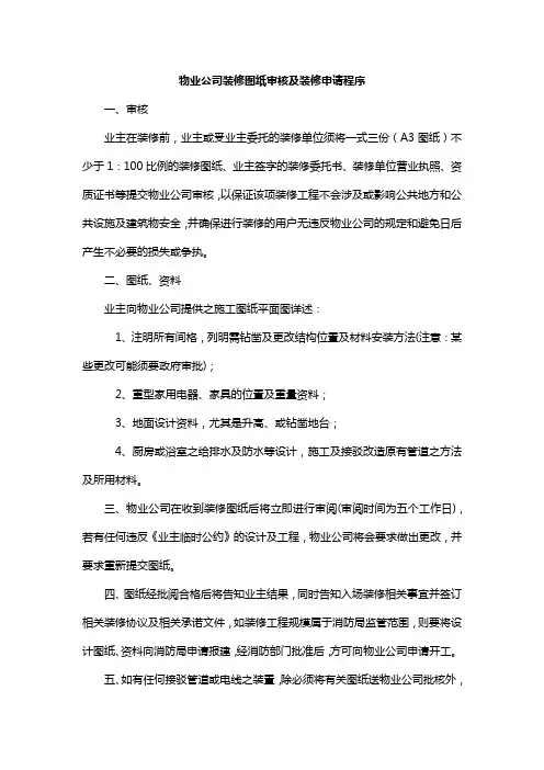 物业公司装修图纸审核及装修申请程序一、审核业主在装修前,业主或受业主委托的装修单位须将一式三份(A3图纸)不少于1:100比例的装修图纸、业主签字的装修委托书、装修单位营业执照、资质证书等提交物业公司审核,以保证该项装修工程不会涉及或影响公共地方和公共设施及建筑物安全,并确保进行装修的用户无违反物业公司的规定和避免日后产生不必要的损失或争执。