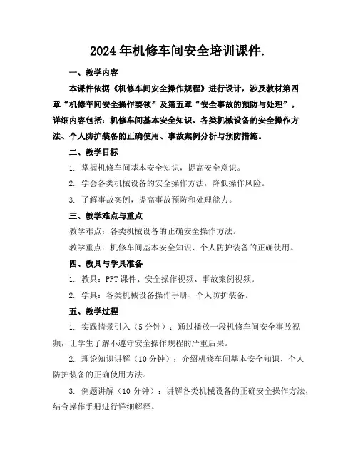 2024年机修车间安全培训课件.一、教学内容本课件依据《机修车间安全操作规程》进行设计,涉及教材第四章“机修车间安全操作要领”及第五章“安全事故的预防与处理”。