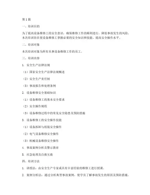 第1篇一、培训目的为了提高设备维修工的安全意识,确保维修工作的顺利进行,降低事故发生的风险,本次培训旨在使设备维修工掌握必要的安全知识和技能,提高安全操作水平。