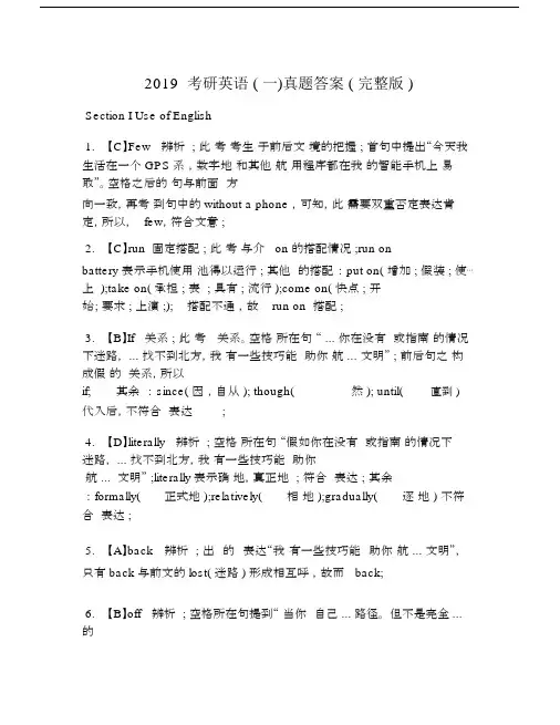 2019 考研英语 ( 一)真题答案 ( 完整版 )Section I Use of English1.【C】Few 辨析 ; 此考考生于前后文境的把握 ; 首句中提出“今天我生活在一个 GPS系,数字地和其他航用程序都在我的智能手机上易取”。