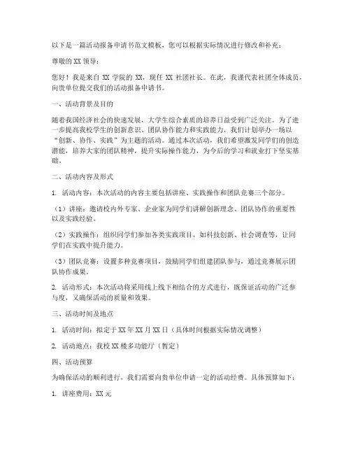 以下是一篇活动报备申请书范文模板,您可以根据实际情况进行修改和补充:尊敬的XX领导:您好!我是来自XX学院的XX,现任XX社团社长。