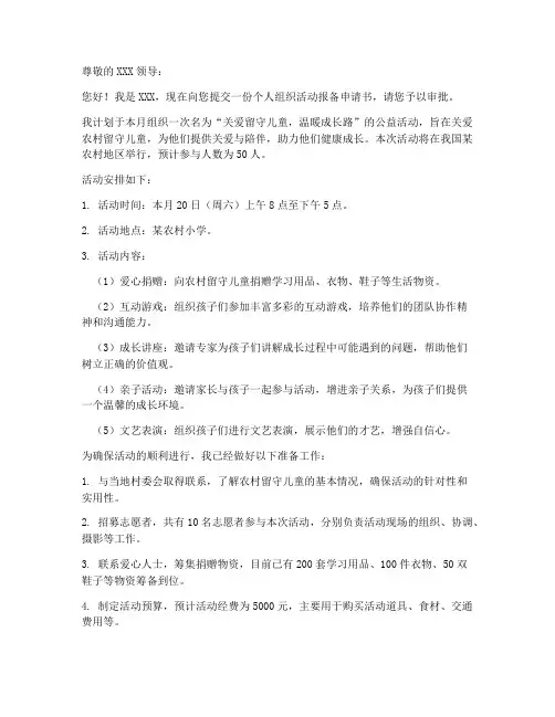 感谢贵部门对我们单位事业发展的关心与支持!此致敬礼!申请人:(签名)申请单位:(盖章)申请日期:XXXX年XX月XX日附件:1. 活动方案详细材料2. 活动预算明细表3. 活动宣传方案4. 活动安全保障预案。
