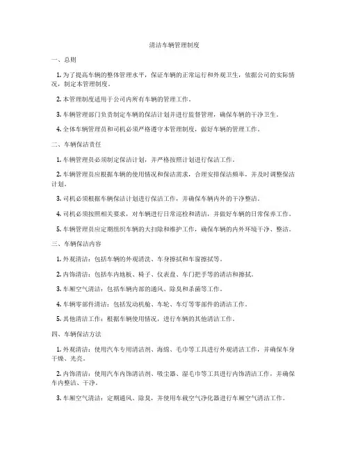 清洁车辆管理制度一、总则1. 为了提高车辆的整体管理水平,保证车辆的正常运行和外观卫生,依据公司的实际情况,制定本管理制度。