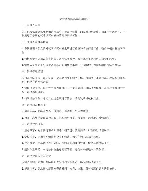 试乘试驾车保养、清洁制度我公司按照上海大众汽车销售有限公司的要求,特配备试乘试驾车辆以供客户在选择车辆时能亲身体验车辆的性能,为方便管理特规定如下;一、在销售过程中,试乘试驾具有十分重要的作用,当产品已引起用户的兴趣时,试乘试驾可让他们更进一步体验到我们产品的质量和特点,以提高销售成功率。