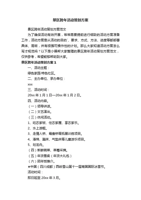 那么大家知道活动方案怎么写才规范吗?以下是小编帮大家整理的景区跨年活动策划方案范文,仅供参考,希望能够帮助到大家。