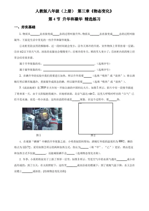 人教版八年级(上册)第三章《物态变化》第4节升华和凝华精选练习一、夯实基础1.物质从_______态直接变成_____态的过程叫做升华;物质从_______态直接变成_____态的过程叫做凝华。