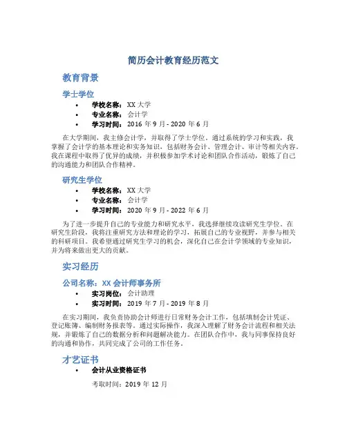 简历会计教育经历范文教育背景学士学位•学校名称: XX大学•专业名称:会计学•学习时间: 2016年9月 - 2020年6月在大学期间,我主修会计学,并取得了学士学位。