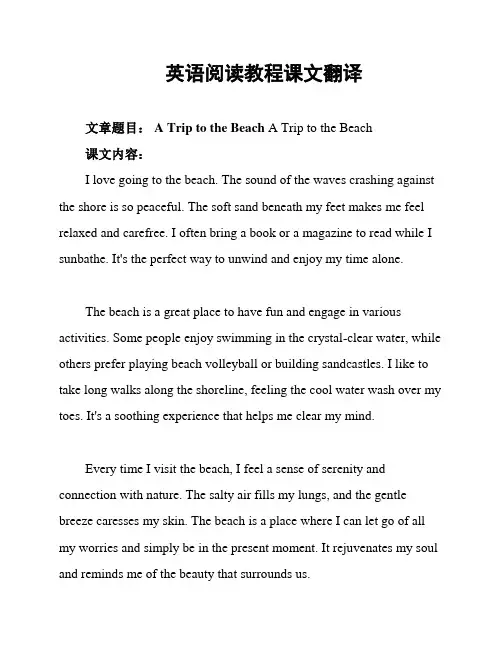 英语阅读教程课文翻译文章题目: A Trip to the Beach A Trip to the Beach课文内容:I love going to the beach. The sound of the waves crashing against the shore is so peaceful. The soft sand beneath my feet makes me feel relaxed and carefree. I often bring a book or a magazine to read while I sunbathe. It's the perfect way to unwind and enjoy my time alone.The beach is a great place to have fun and engage in various activities. Some people enjoy swimming in the crystal-clear water, while others prefer playing beach volleyball or building sandcastles. I like to take long walks along the shoreline, feeling the cool water wash over my toes. It's a soothing experience that helps me clear my mind.Every time I visit the beach, I feel a sense of serenity and connection with nature. The salty air fills my lungs, and the gentle breeze caresses my skin. The beach is a place where I can let go of all my worries and simply be in the present moment. It rejuvenates my soul and reminds me of the beauty that surrounds us.In conclusion, the beach is a magical place that offers relaxation, fun, and stunning views. It is a sanctuary where one can escape from the hustle and bustle of daily life. Whether it's reading a book, enjoying water activities, or marveling at sunsets, the beach brings joy and peace to all who visit.课文翻译:我喜欢去海滩。