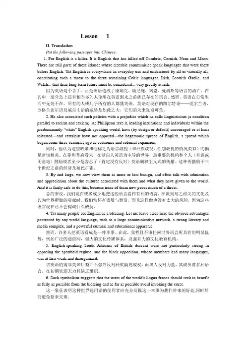 Lesson 1II. TranslationPut the following passages into Chinese.1. For English is a killer. It is English that has killed off Cumbric, Cornish, Norn and Manx. There are still parts of these islands where sizeable communities speak languages that were there before English. Yet English is everywhere in everyday use and understood by all or virtually all, constituting such a threat to the three remaining Celtic languages, Irish, Scottish Gaelic, and Welsh... that their long-term future must be considered... very greatly at risk.因为英语是个杀手。