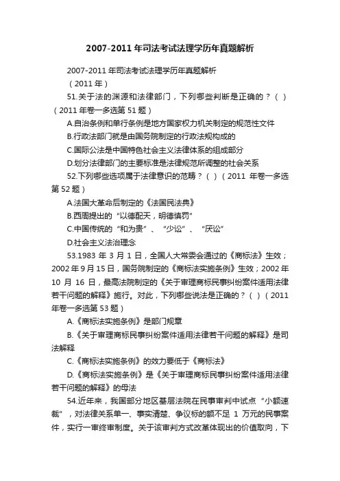 2007-2011年司法考试法理学历年真题解析2007-2011年司法考试法理学历年真题解析(2011年)51.关于法的渊源和法律部门,下列哪些判断是正确的?()(2011年卷一多选第51题)A.自治条例和单行条例是地方国家权力机关制定的规范性文件B.行政法部门就是由国务院制定的行政法规构成的C.国际公法是中国特色社会主义法律体系的组成部分D.划分法律部门的主要标准是法律规范所调整的社会关系52.下列哪些选项属于法律意识的范畴?()(2011年卷一多选第52题)A.法国大革命后制定的《法国民法典》B.西周提出的“以德配天,明德慎罚”C.中国传统的“和为贵”、“少讼”、“厌讼”D.社会主义法治理念53.1983年3月1日,全国人大常委会通过的《商标法》生效;2002年9月15日,国务院制定的《商标法实施条例》生效;2002年10月16日,最高法院制定的《关于审理商标民事纠纷案件适用法律若干问题的解释》施行。