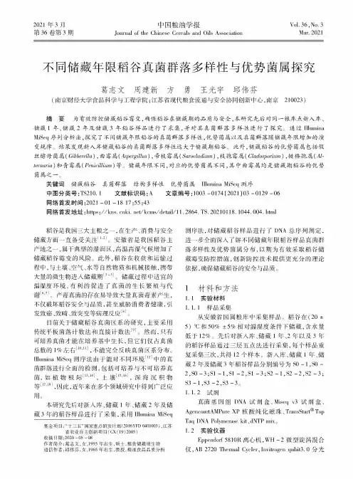 Vol. 36 ,No.3Mar. 20212021年3月 第36卷第3期中国粮油学报Journal of the Chinese Cereals and Oils Association 不同储藏年限稻谷真菌群落多样性与优势菌属探究葛志文 周建新 方 勇 王光宇 邱伟芬(南京财经大学食品科学与工程学院;江苏省现代粮食流通与安全协同创新中心,南京210023)摘要为有效防控储藏稻谷霉变,确保稻谷在储藏期的+质与安全,本研究先后对同一粮库点新入库、 储藏1年、储藏2年及储藏3年稻谷样+进行了采集,并对其真菌群落多样性进行了探究。