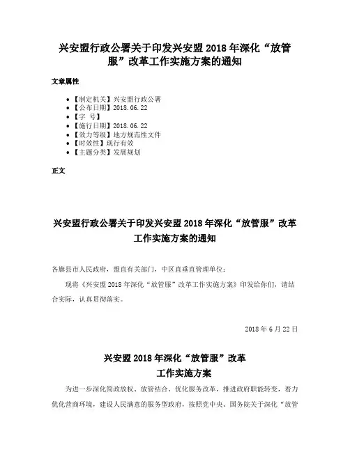 2018年6月22日兴安盟2018年深化“放管服”改革工作实施方案为进一步深化简政放权、放管结合、优化服务改革,推进政府职能转变,着力优化营商环境,建设人民满意的服务型政府,按照党中央、国务院关于深化“放管服”改革工作的决策部署和自治区人民政府的工作安排,结合我盟实际,制定如下实施方案。