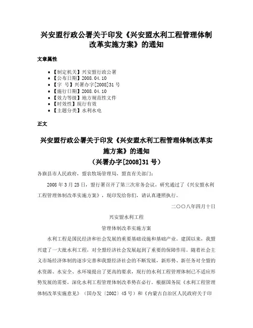 兴安盟行政公署关于印发《兴安盟水利工程管理体制改革实施方案》的通知文章属性•【制定机关】兴安盟行政公署•【公布日期】2008.04.10•【字号】兴署办字[2008]31号•【施行日期】2008.04.10•【效力等级】地方规范性文件•【时效性】现行有效•【主题分类】水利水电正文兴安盟行政公署关于印发《兴安盟水利工程管理体制改革实施方案》的通知(兴署办字[2008]31号)各旗县市人民政府,盟农牧场管理局,盟直有关部门:2008年3月25日,盟行署召开了第三次常务会议,研究通过了《兴安盟水利工程管理体制改革实施方案》,现印发给你们,请认真遵照执行。