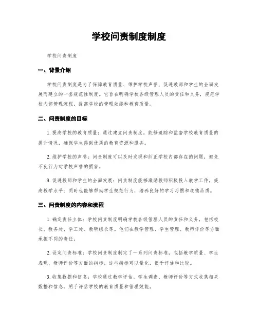 二、制度目标1. 规范学校管理,提高教育教学质量;2. 强化责任意识,明确各部门职责;3. 建立健全问责机制,确保学校各项工作落到实处;4. 促进学校持续健康发展。