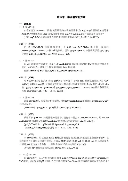 第六章络合滴定补充题一计算题1 5 分(0745)在总浓度为0.10mol/L的银-硫代硫酸络合物的溶液中,当Ag(S2O3)35-型体的浓度等于Ag(S2O3)-型体浓度的1000倍时,溶液中游离S2O32-和Ag(S2O3)-型体的浓度各为多少?(已知Ag+-S2O32-形成逐级络合物的累积稳定常数β1=109.0, β2=1013.0, β3=1014.0)2 10 分(0746)在1L NH3-NH4Cl的缓冲溶液中, 含0.10 mol Zn2+-EDTA络合物, 溶液的pH=9.0,[NH3]=0.10 mol/L,计算Zn2+的浓度。