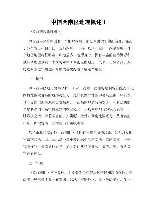 中国西南区地理概述1中国西南区地理概述中国西南区是中国的一个地理区域,地处中国大陆的西南部,涵盖了多个省份和自治区,包括四川、云南、贵州、重庆、西藏等地。