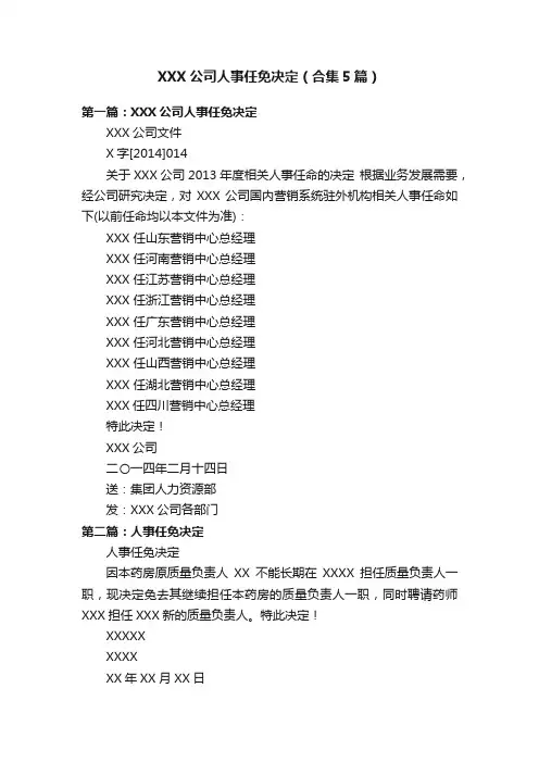 XXX公司人事任免决定(合集5篇)第一篇:XXX公司人事任免决定XXX公司文件X字[2014]014关于XXX公司2013年度相关人事任命的决定根据业务发展需要,经公司研究决定,对XXX公司国内营销系统驻外机构相关人事任命如下(以前任命均以本文件为准):XXX 任山东营销中心总经理XXX 任河南营销中心总经理XXX 任江苏营销中心总经理XXX 任浙江营销中心总经理XXX 任广东营销中心总经理XXX 任河北营销中心总经理XXX 任山西营销中心总经理XXX 任湖北营销中心总经理XXX任四川营销中心总经理特此决定!XXX公司二〇一四年二月十四日送:集团人力资源部发:XXX公司各部门第二篇:人事任免决定人事任免决定因本药房原质量负责人XX不能长期在XXXX担任质量负责人一职,现决定免去其继续担任本药房的质量负责人一职,同时聘请药师XXX担任XXX新的质量负责人。